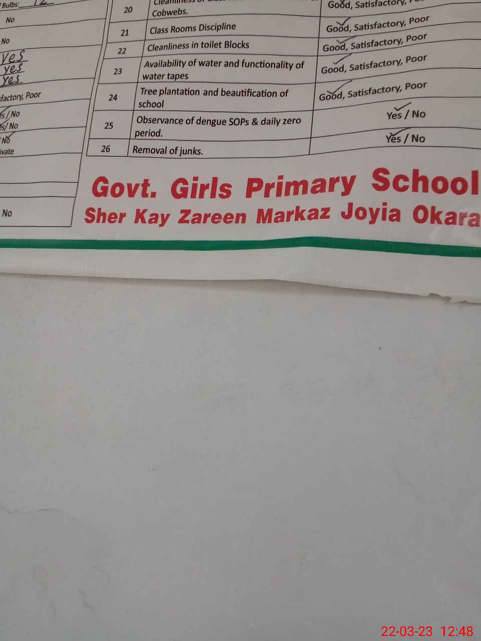 | District: OKARA | Tehsil: OKARA | Markaz: JOIYA - FEMALE | Level: Primary | |