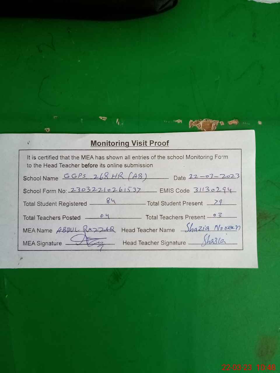 | Attendance Register | Head Teacher | MEA with School | Visit Proof |