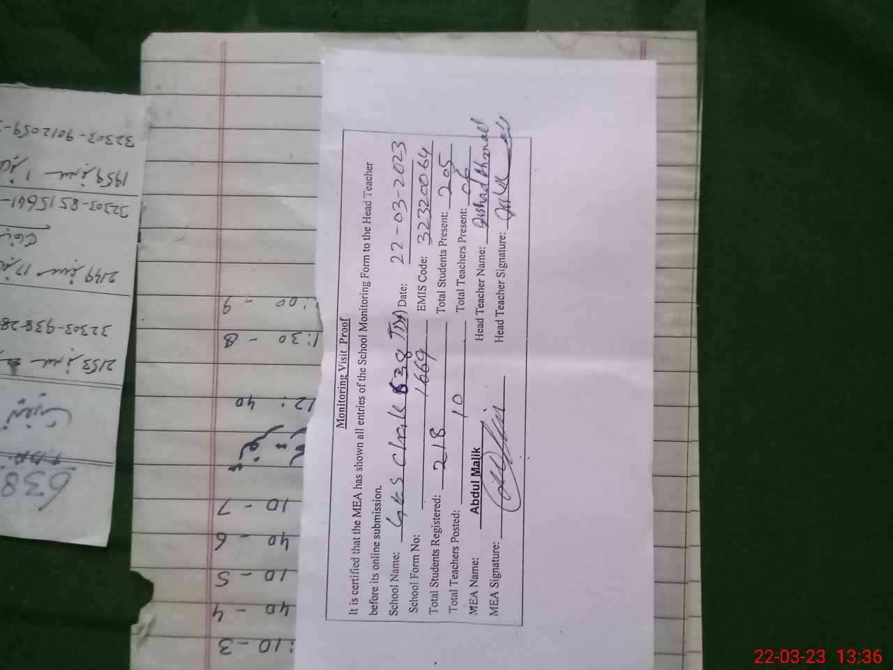 | Attendance Register | Head Teacher | MEA with School | Visit Proof |