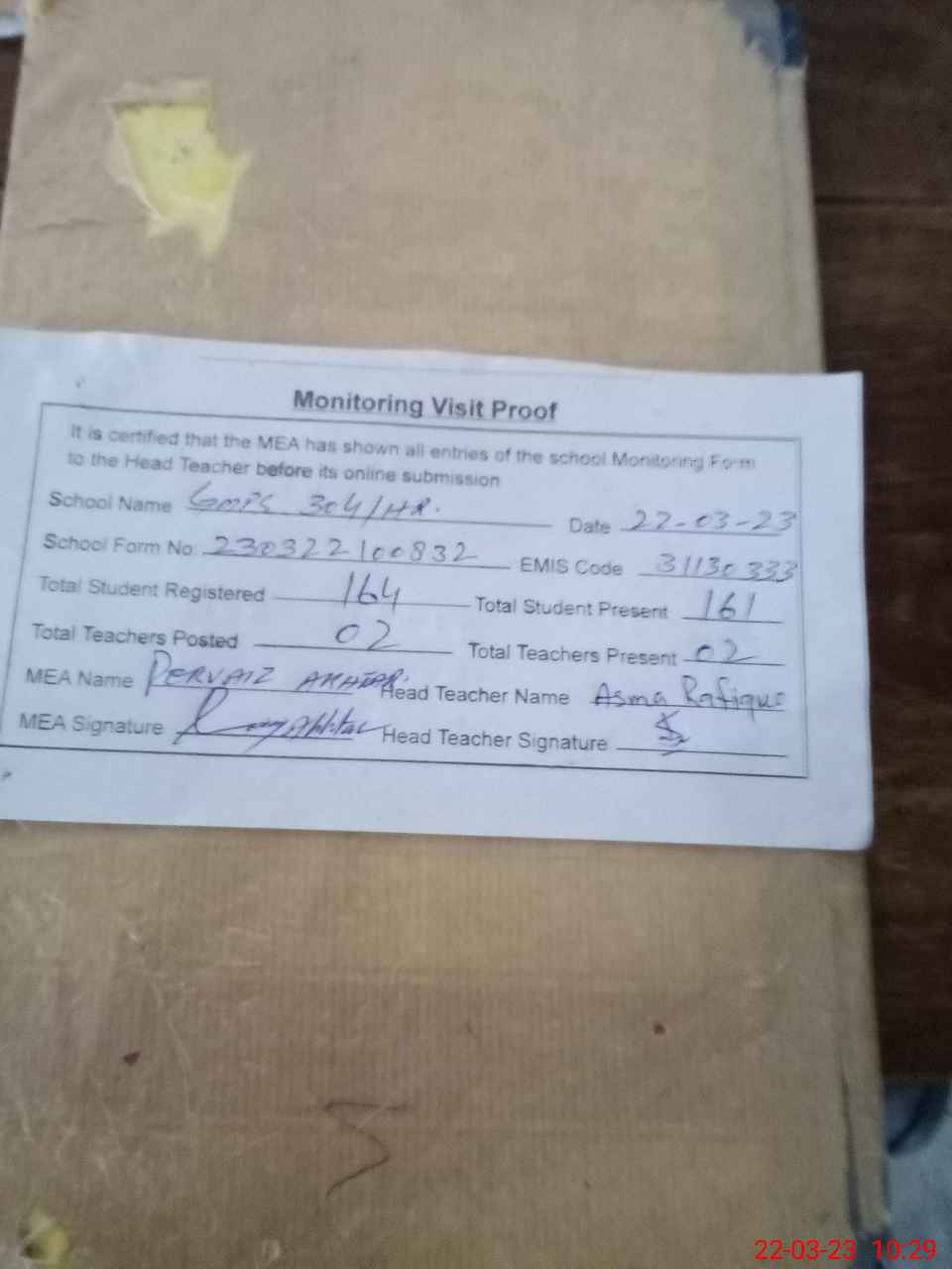 | Attendance Register | Head Teacher | MEA with School | Visit Proof |