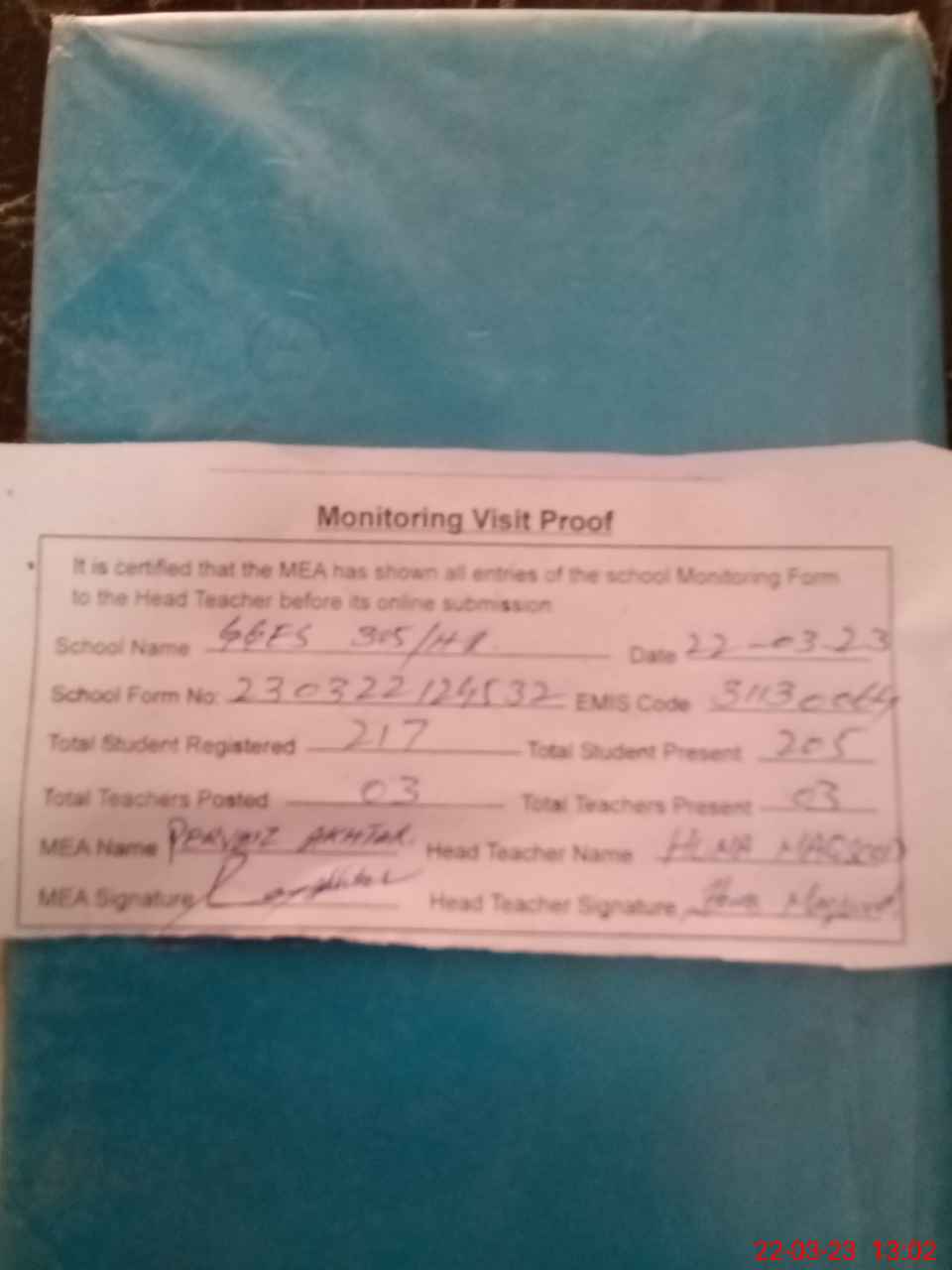 | Attendance Register | Head Teacher | MEA with School | Visit Proof |
