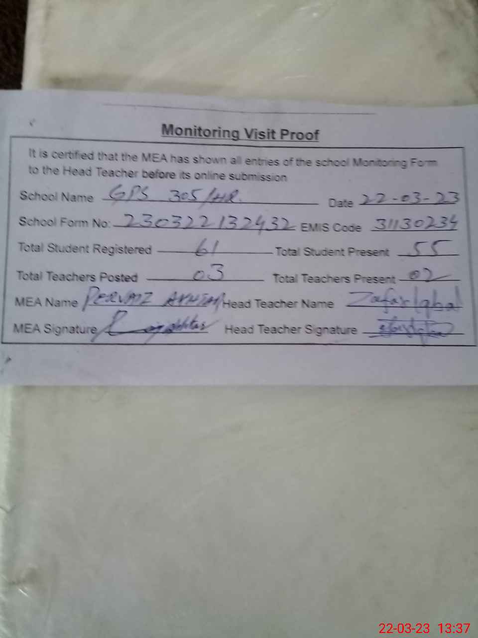 | Attendance Register | Head Teacher | MEA with School | Visit Proof |