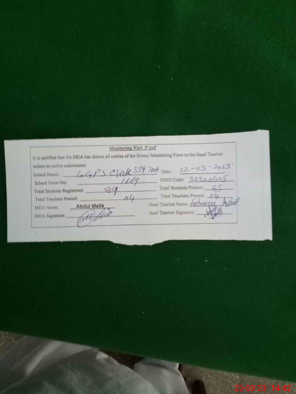 | Attendance Register | Head Teacher | MEA with School | Visit Proof |