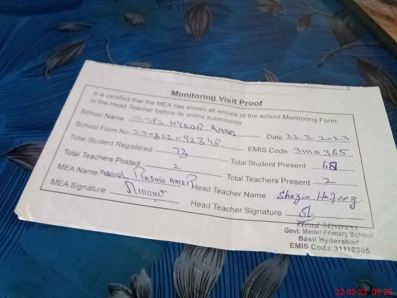 | Certified that this School was Inspected by the Undersigned MEA/DMO Today and the Information Stated Above is as Per Record. | |||||