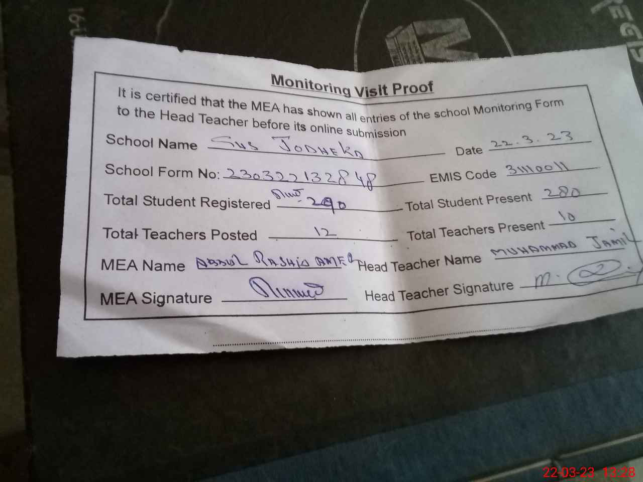 | Attendance Register | Head Teacher | MEA with School | Visit Proof |