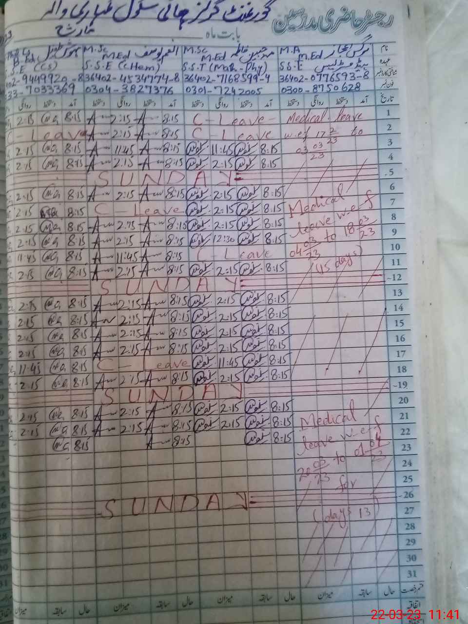 | Name: Ma**** Fa**** Designation: (School Headmaster's/Headmistress's) S.S.T.(Science ) Phone/Cell Number: 03**** |