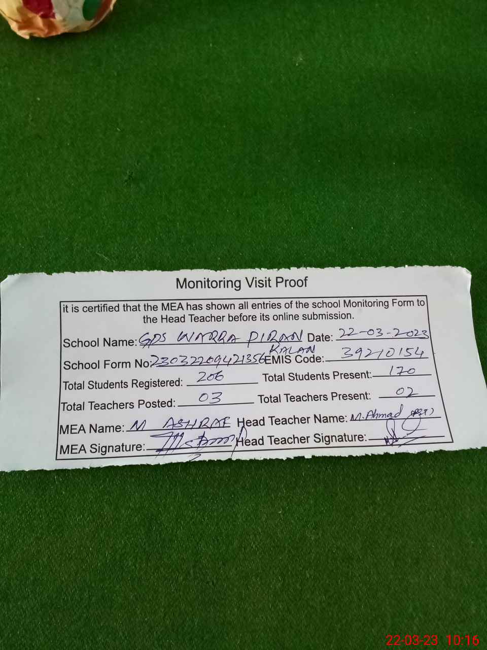 | EMIS Code: 39210154 | Name of School: GPS WARRA PIRAN KALAN | |||