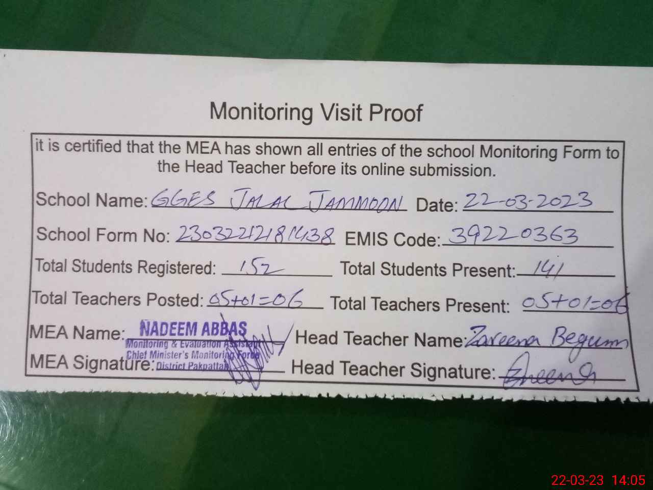 | Attendance Register | Head Teacher | MEA with School | Visit Proof |