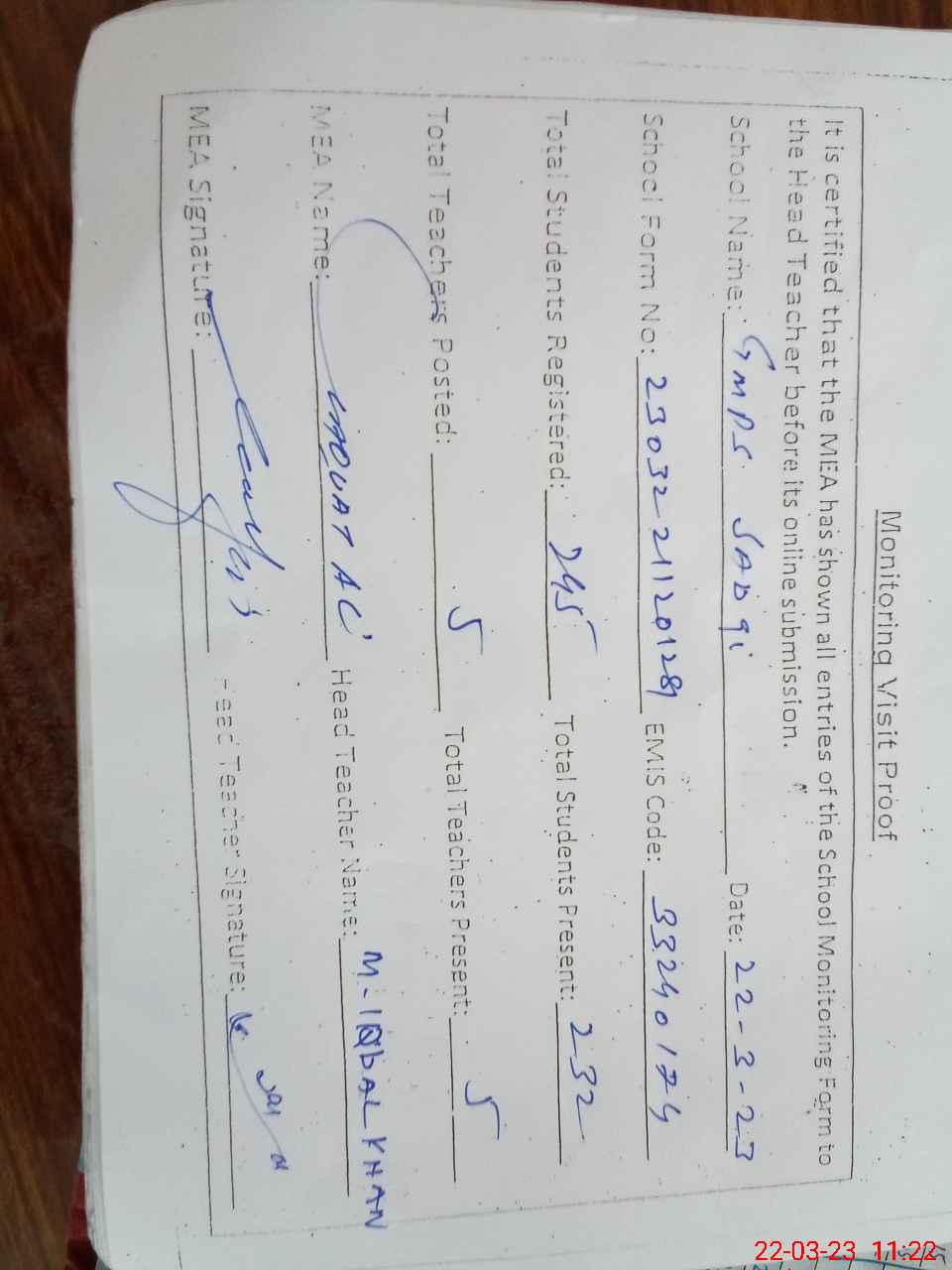 | Attendance Register | Head Teacher | MEA with School | Visit Proof |