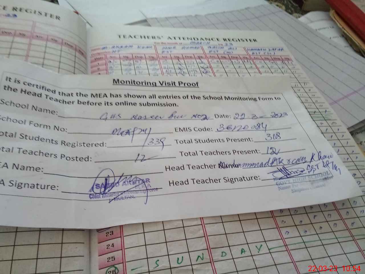 | Attendance Register | Head Teacher | MEA with School | Visit Proof |