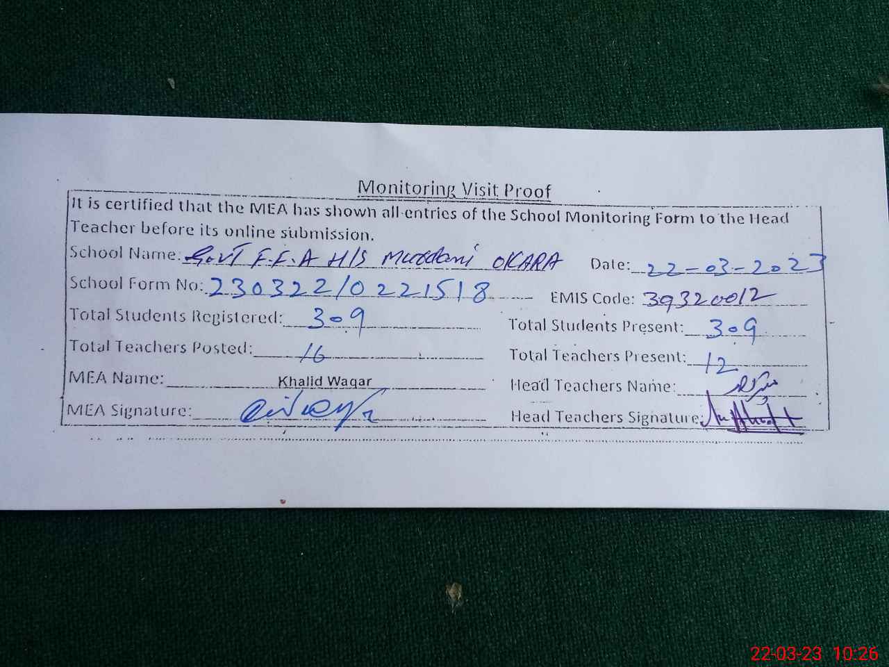 | Certified that this School was Inspected by the Undersigned MEA/DMO Today and the Information Stated Above is as Per Record. | |||||