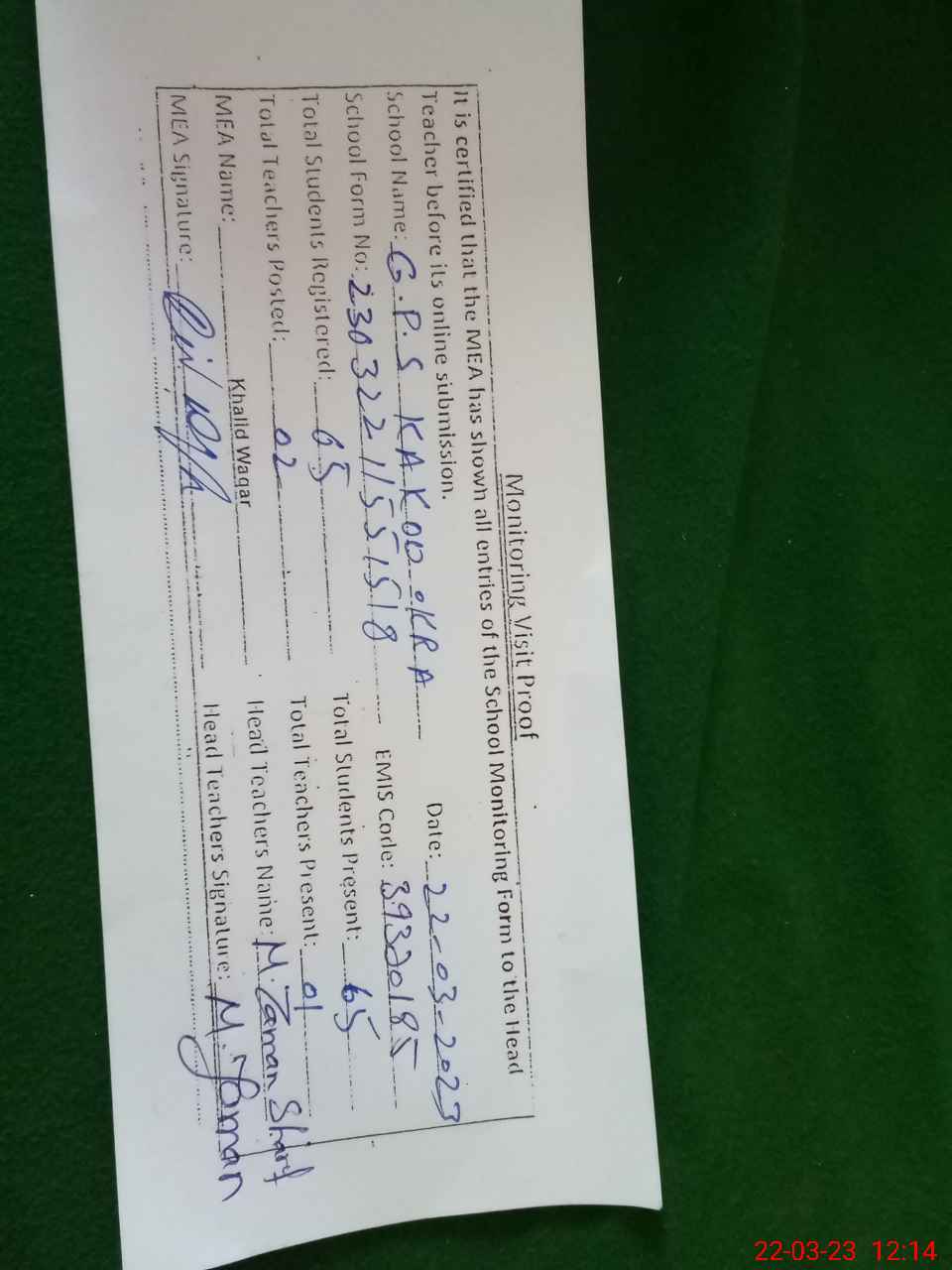 | Attendance Register | Head Teacher | MEA with School | Visit Proof |