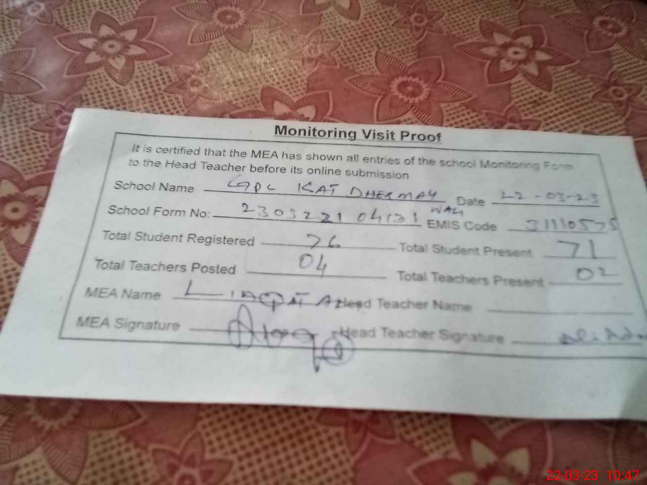 | Attendance Register | Head Teacher | MEA with School | Visit Proof |