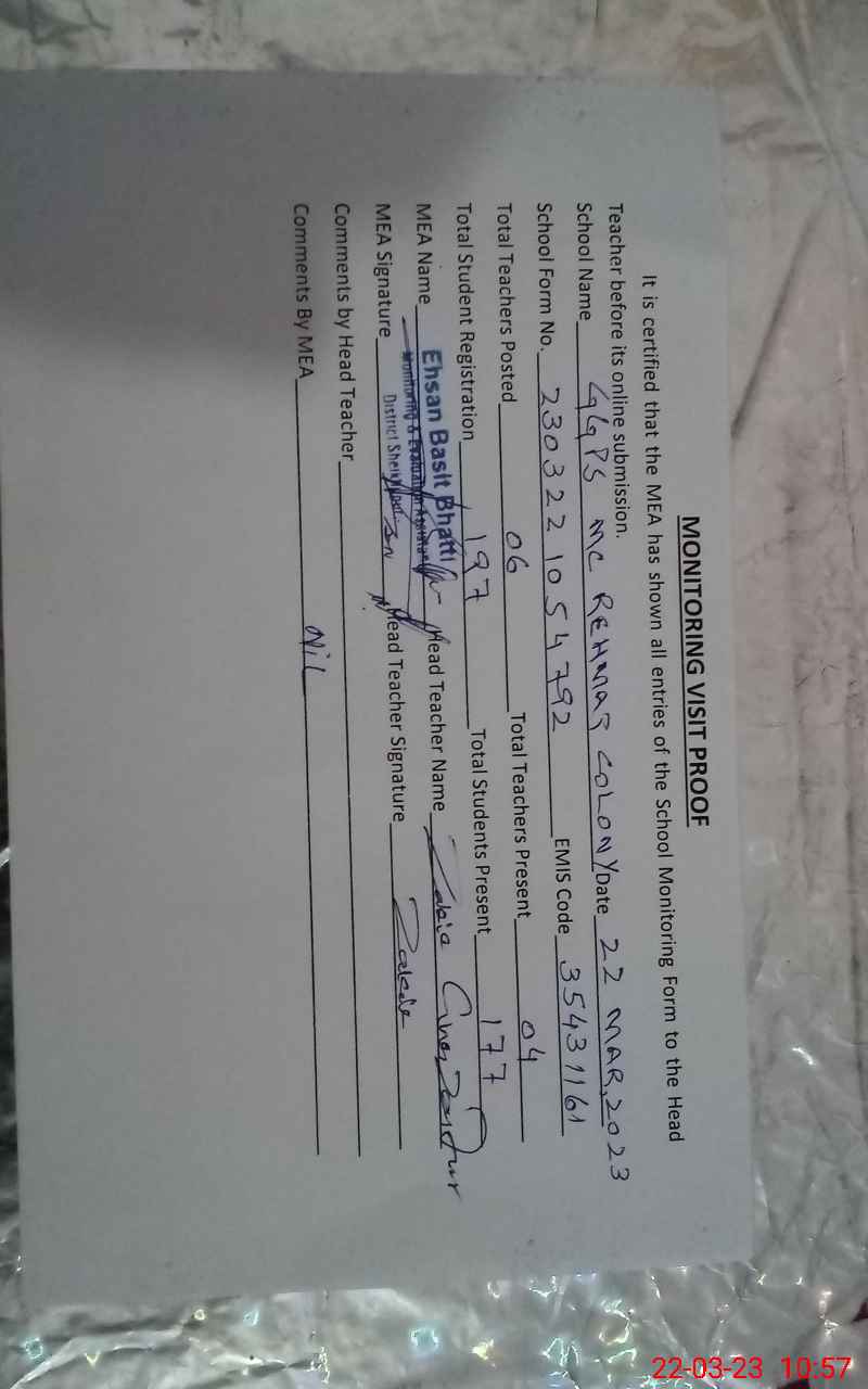 | EMIS Code: 35431161 | Name of School: GGPS MC REHMAT COLONY | |||