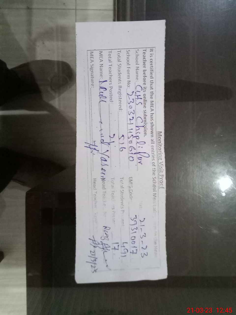 | Monitoring Date: 21-03-2023 | Start Time: 21-03-2023 11:50 AM | End Time: 21-03-2023 12:46 PM | Name of MEA: MU**** YA**** | |