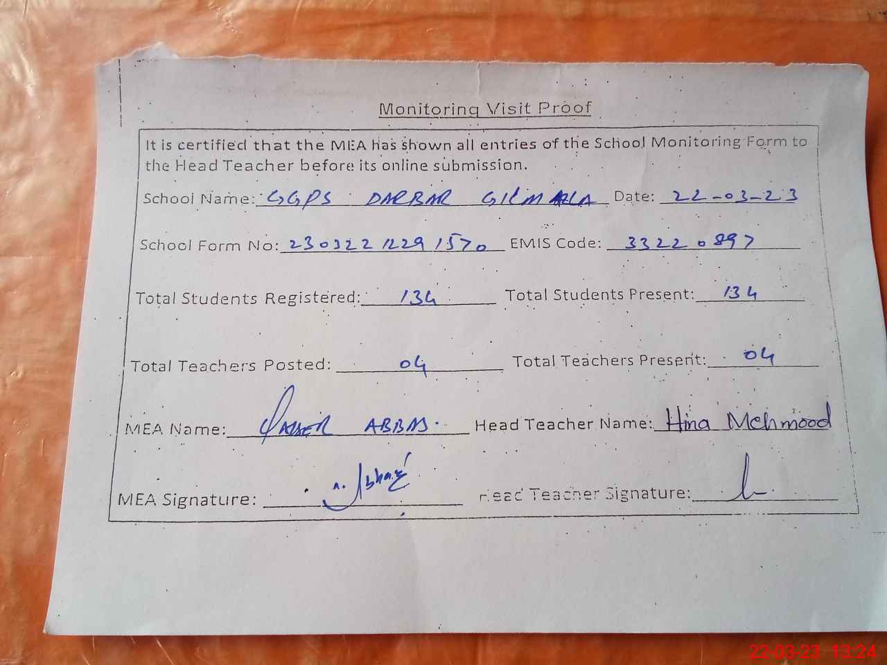 | Attendance Register | Head Teacher | MEA with School | Visit Proof |