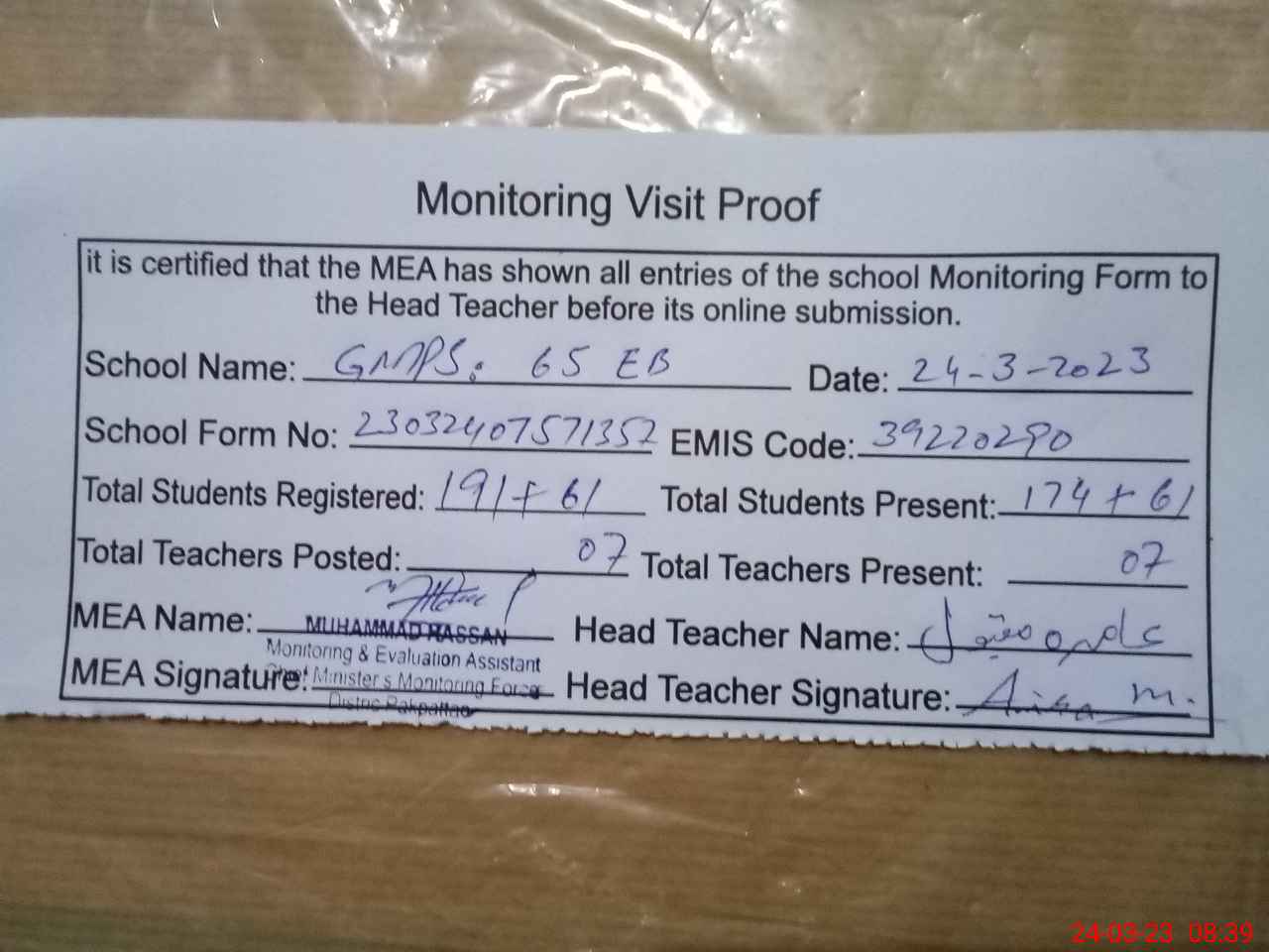 | Certified that this School was Inspected by the Undersigned MEA/DMO Today and the Information Stated Above is as Per Record. | |||||