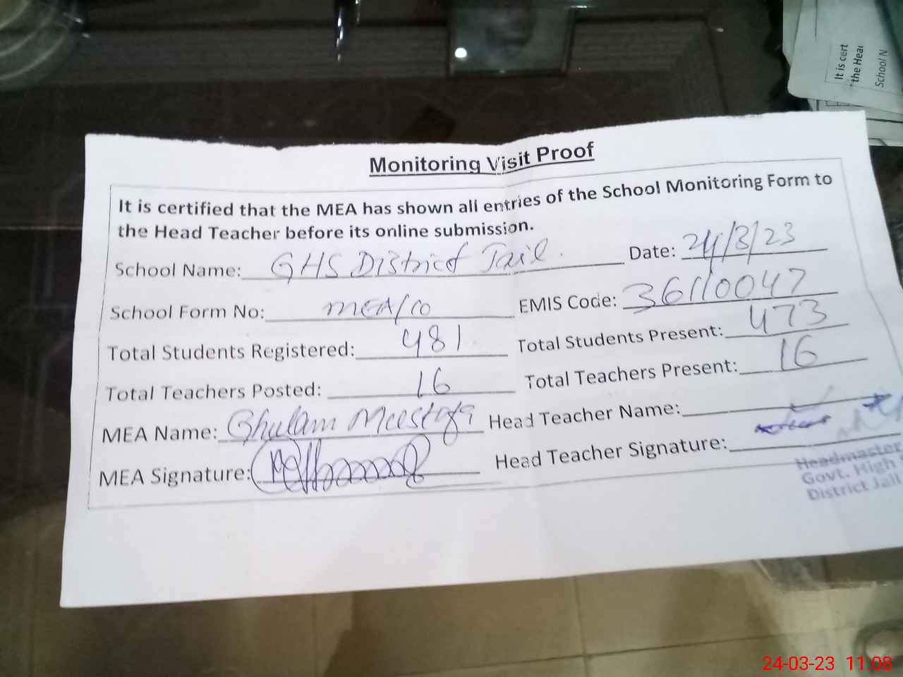 | Attendance Register | Head Teacher | MEA with School | Visit Proof |