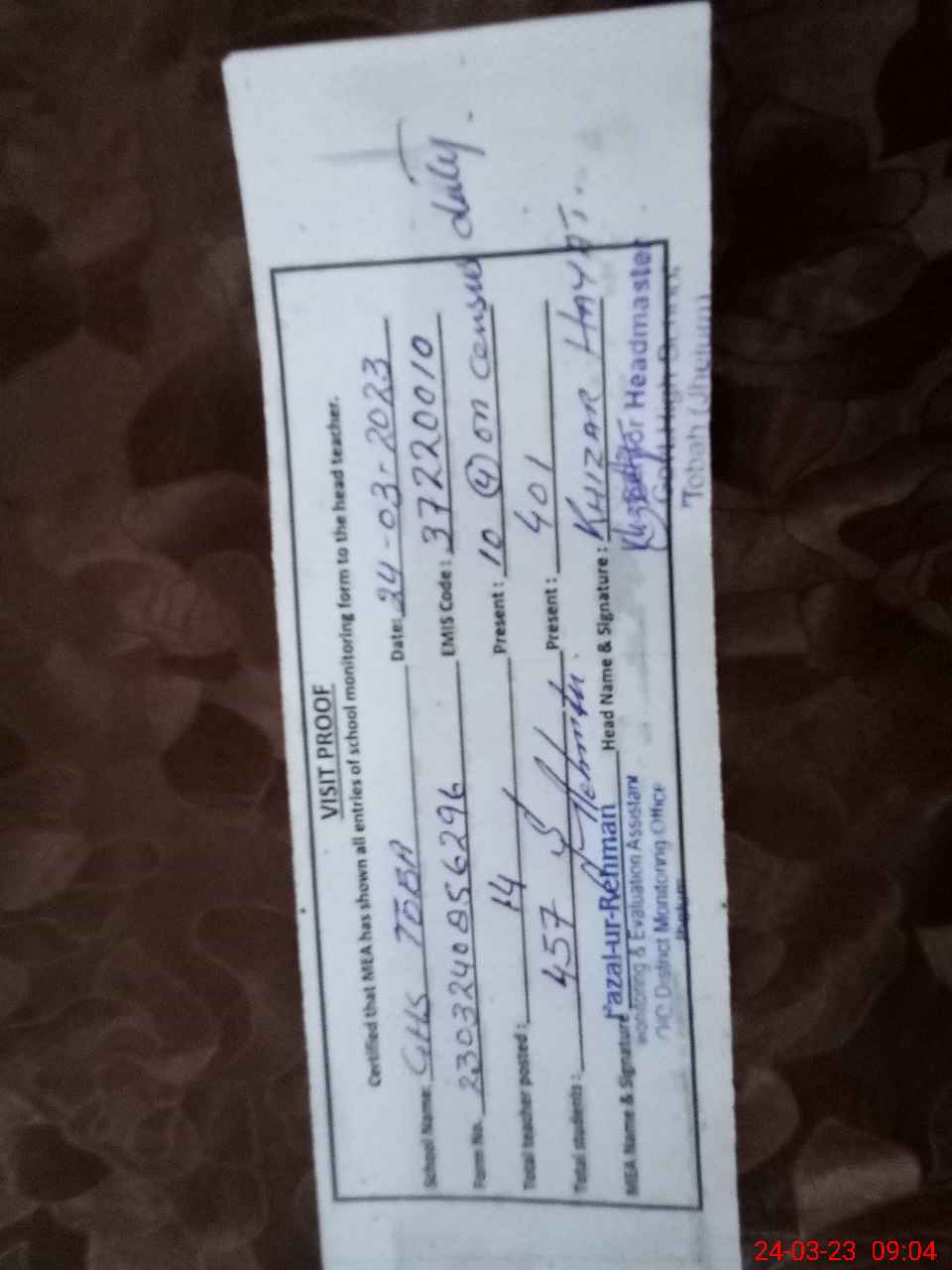 | Attendance Register | Head Teacher | MEA with School | Visit Proof |