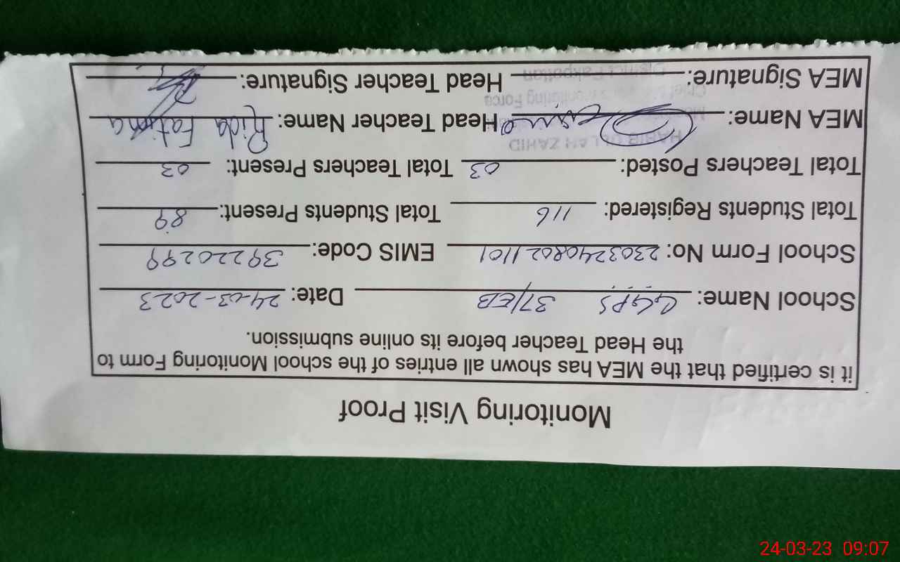 | Attendance Register | Head Teacher | MEA with School | Visit Proof |