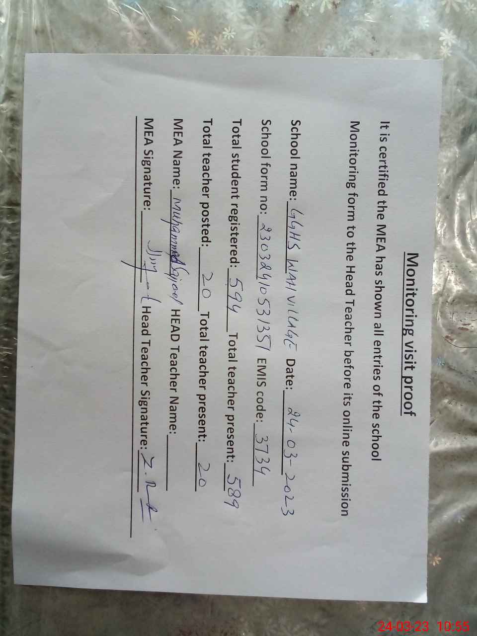 | Attendance Register | Head Teacher | MEA with School | Visit Proof |