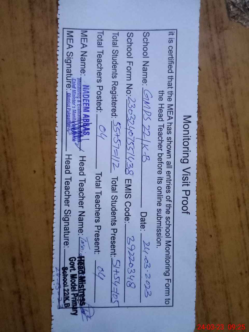 | Attendance Register | Head Teacher | MEA with School | Visit Proof |