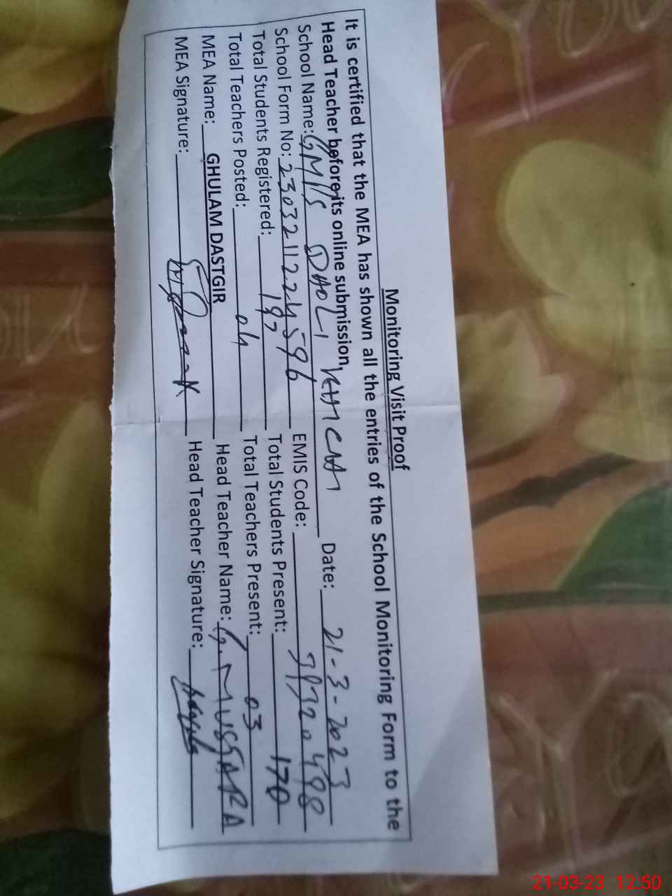 | Attendance Register | Head Teacher | MEA with School | Visit Proof |