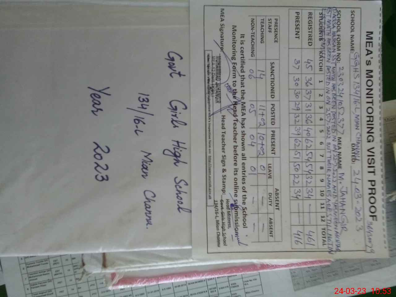 | Attendance Register | Head Teacher | MEA with School | Visit Proof |