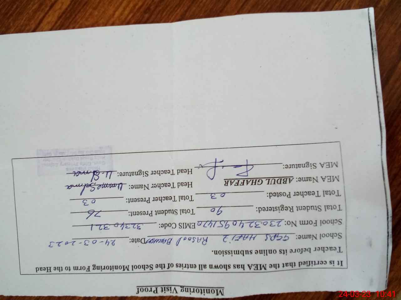 | Certified that this School was Inspected by the Undersigned MEA/DMO Today and the Information Stated Above is as Per Record. | |||||