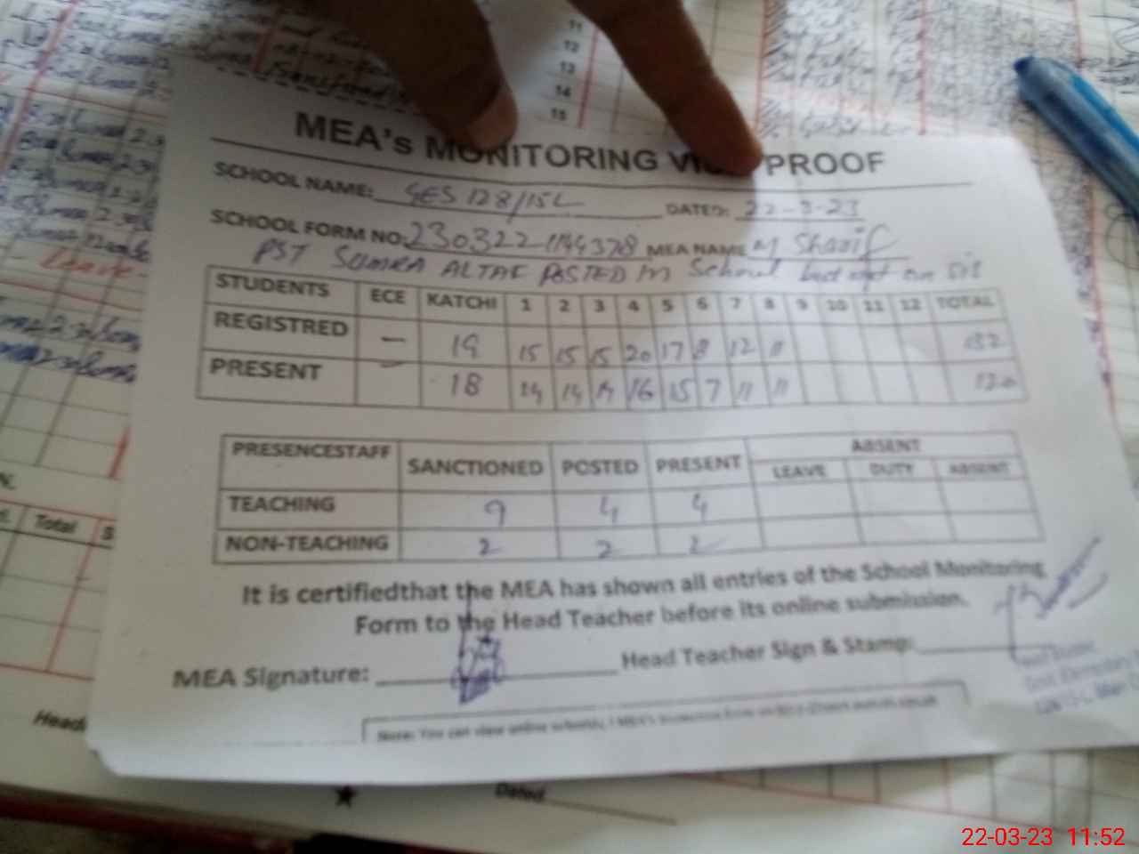 | Attendance Register | Head Teacher | MEA with School | Visit Proof |