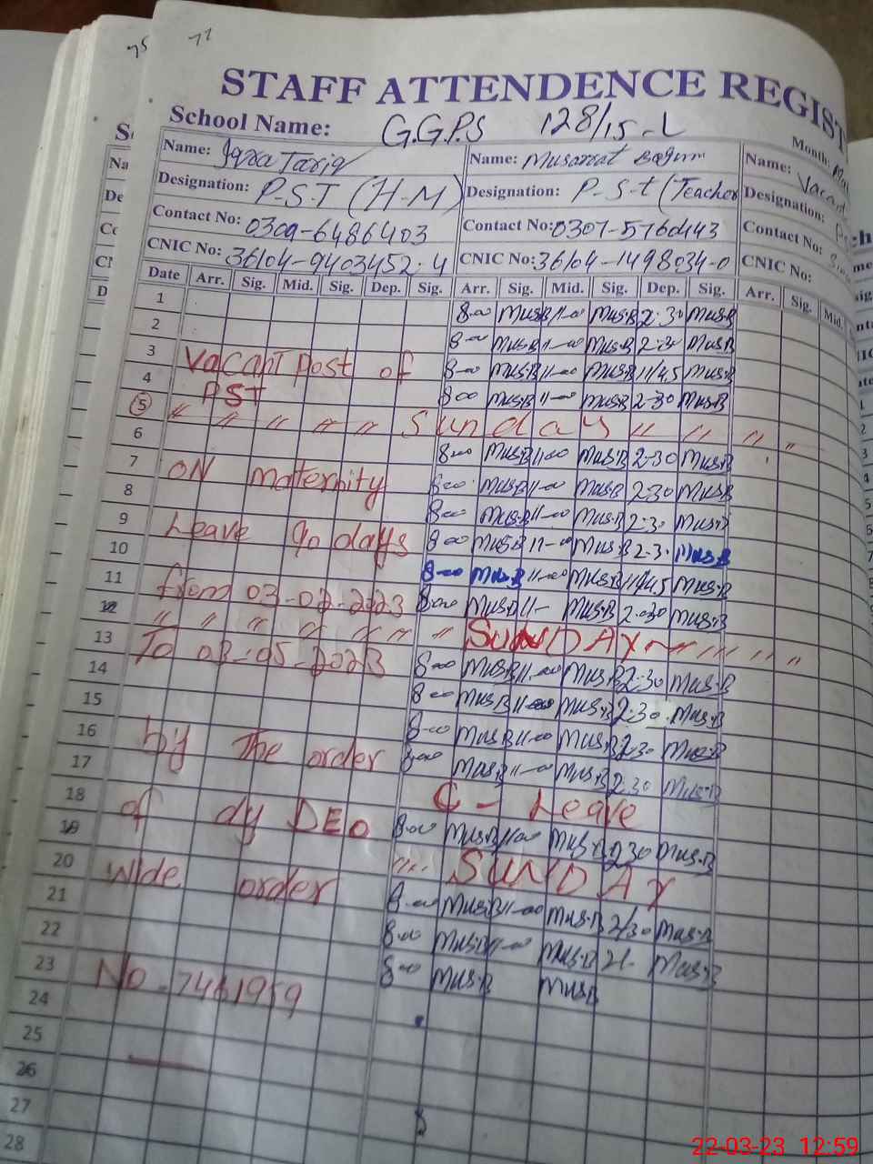 | Name: Iq**** Ta**** Designation: (School Headmaster's/Headmistress's) PST Phone/Cell Number: 03**** |