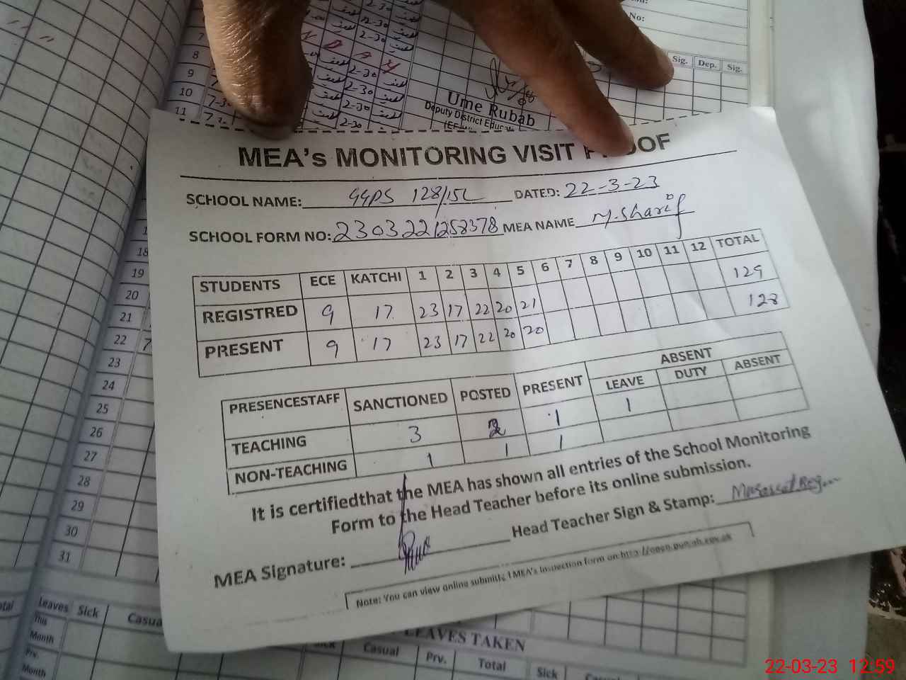 | Attendance Register | Head Teacher | MEA with School | Visit Proof |