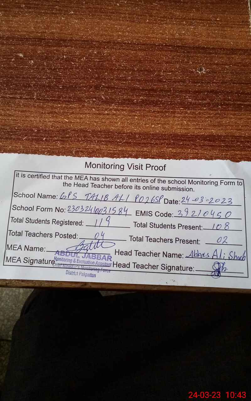 | EMIS Code: 39210450 | Name of School: GPS TALIB ALI P/O 26 S.P | |||