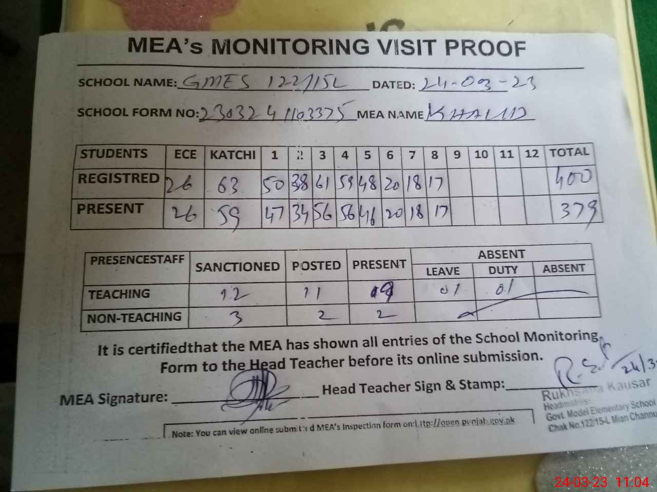 | Attendance Register | Head Teacher | MEA with School | Visit Proof |