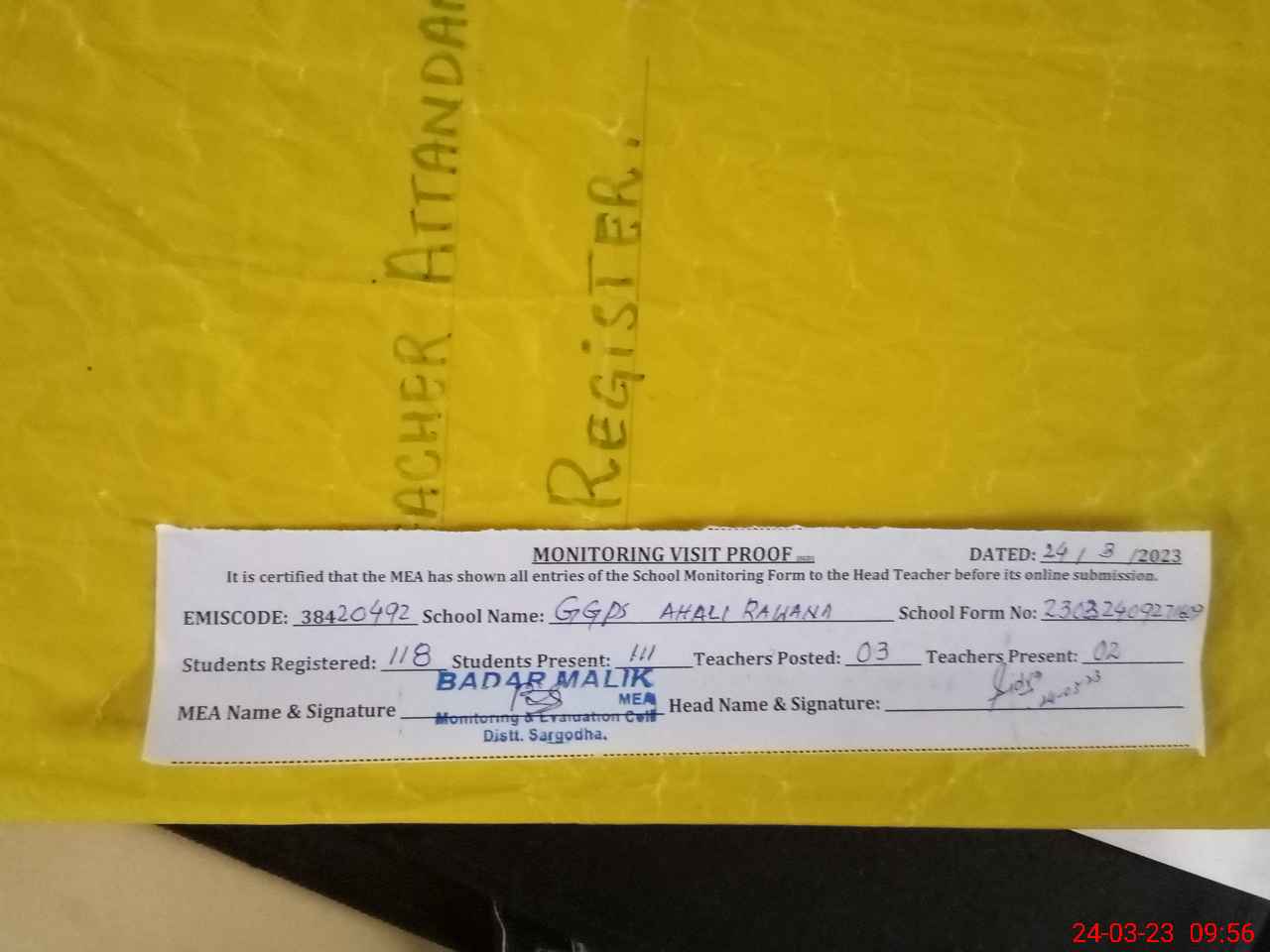| Attendance Register | Head Teacher | MEA with School | Visit Proof |