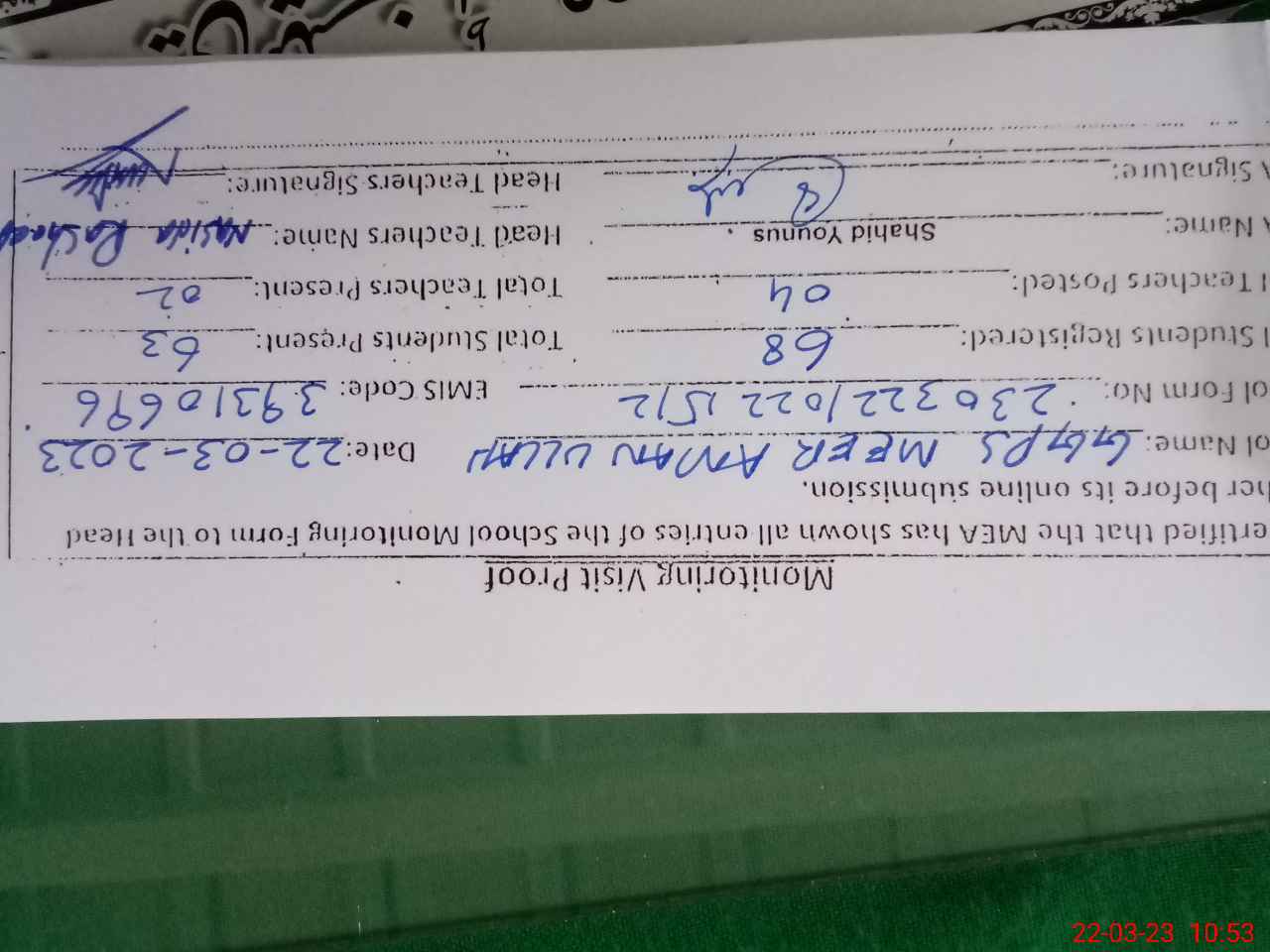 | Monitoring Date: 22-03-2023 | Start Time: 22-03-2023 10:22 AM | End Time: 22-03-2023 10:53 AM | Name of MEA: SH**** YO**** | |