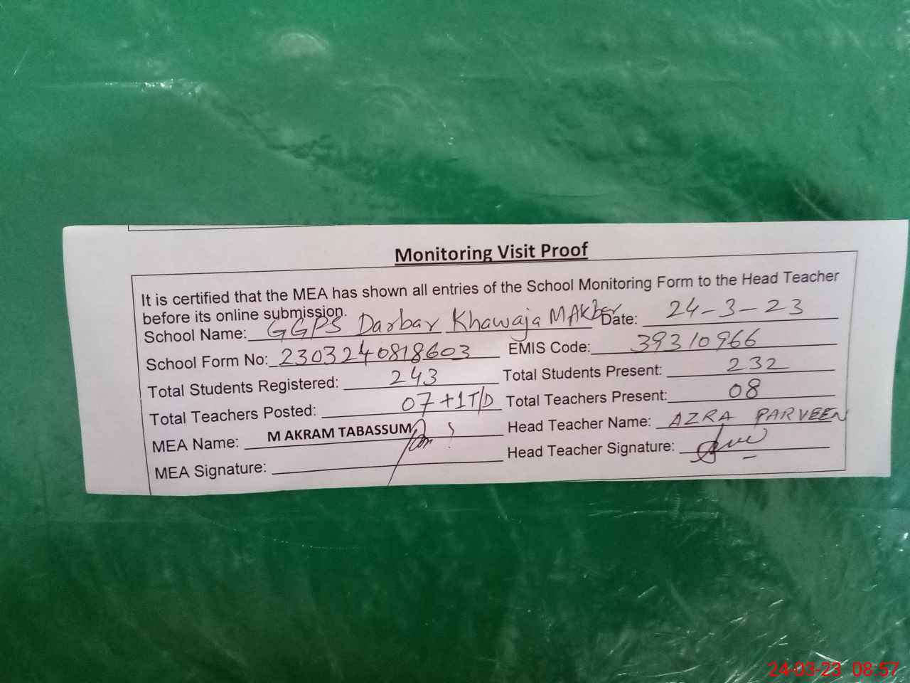 | Attendance Register | Head Teacher | MEA with School | Visit Proof |