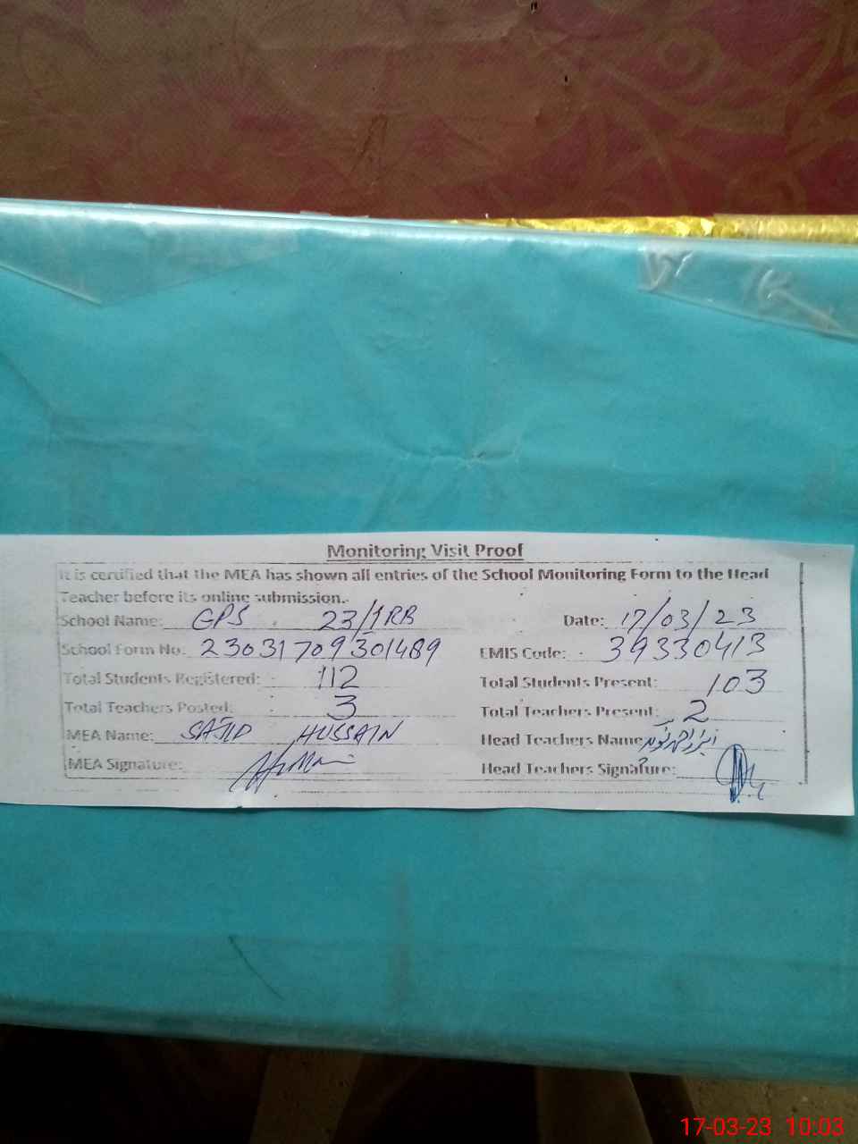 | Attendance Register | Head Teacher | MEA with School | Visit Proof |