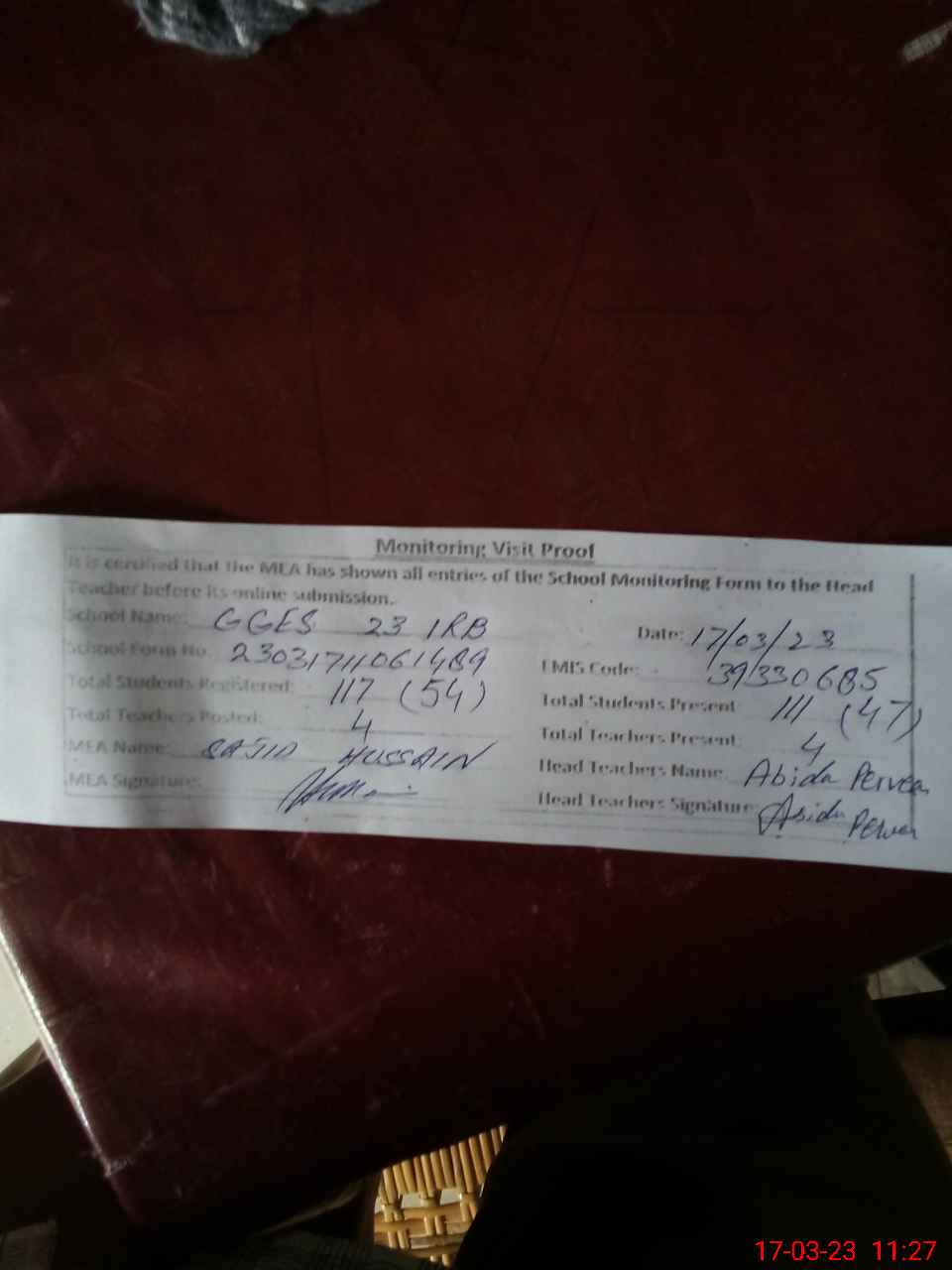 | EMIS Code: 39330685 | Name of School: GGPS CHAK NO. 23/1-RB | |||