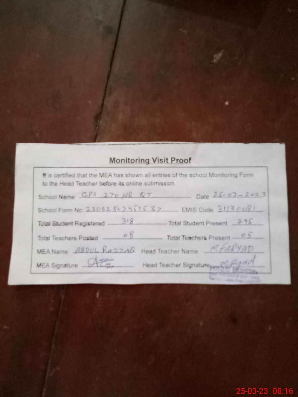 | EMIS Code: 31130081 | Name of School: GPS CHAK NO.270/HR QADIR TOWN | |||