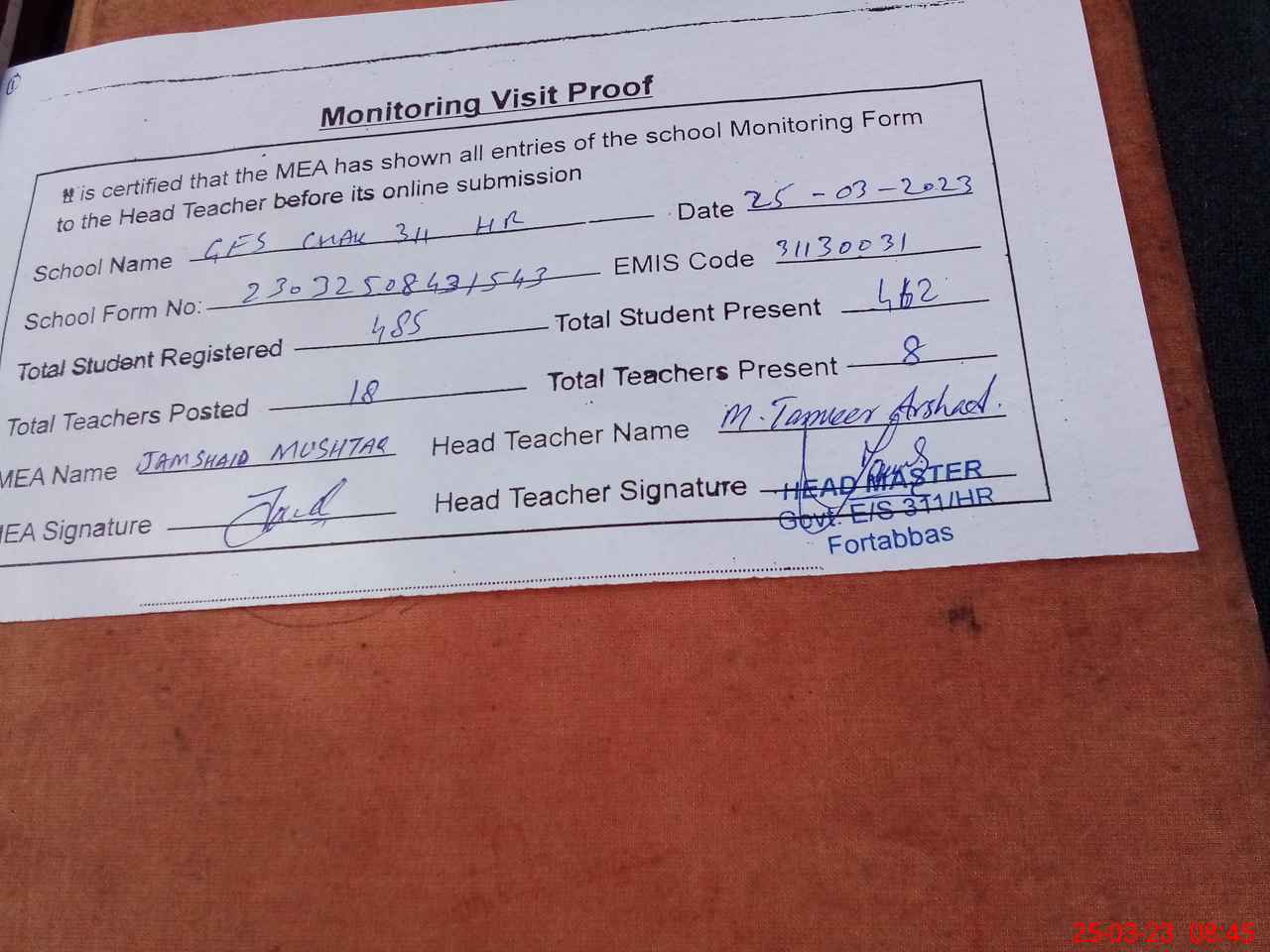 | Attendance Register | Head Teacher | MEA with School | Visit Proof |