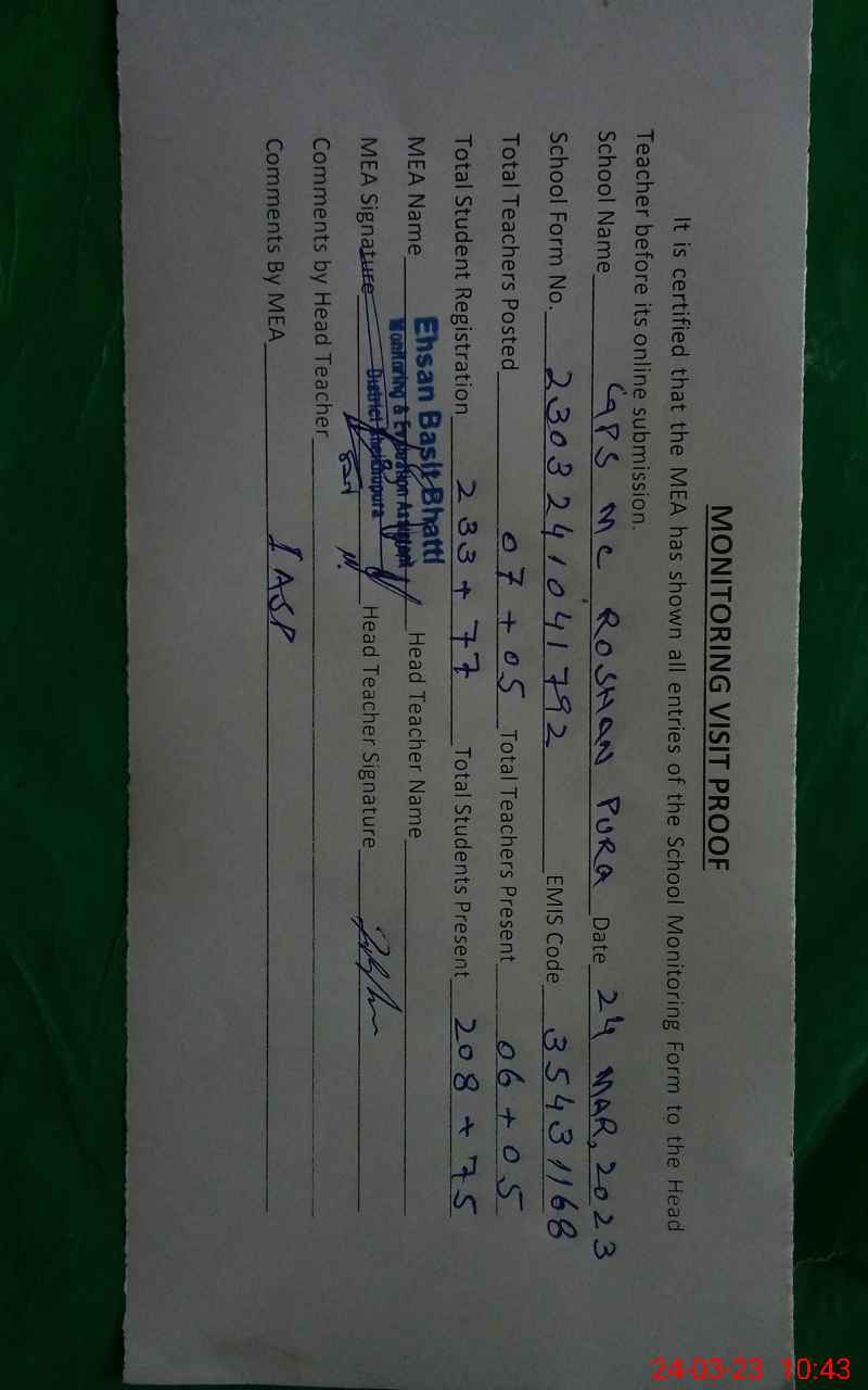 | EMIS Code: 35431168 | Name of School: GPS MC ROSHAN PURA | |||