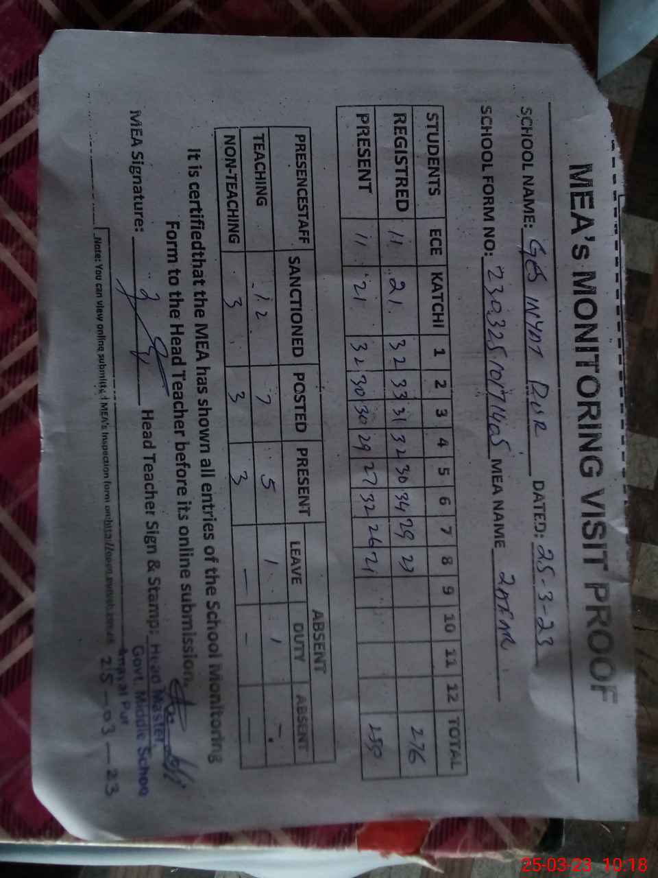 | Attendance Register | Head Teacher | MEA with School | Visit Proof |