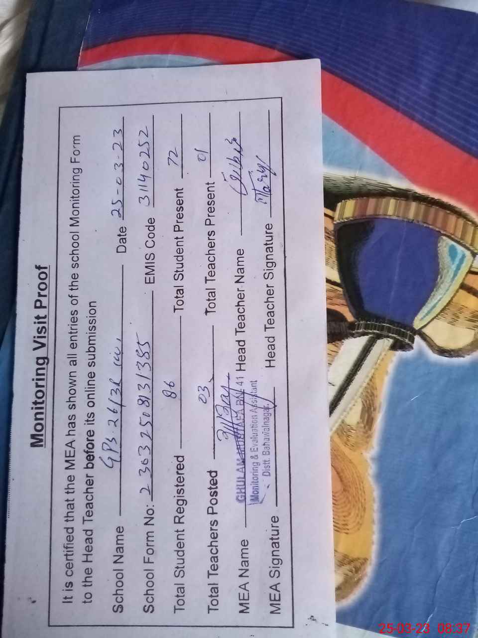 | Attendance Register | Head Teacher | MEA with School | Visit Proof |