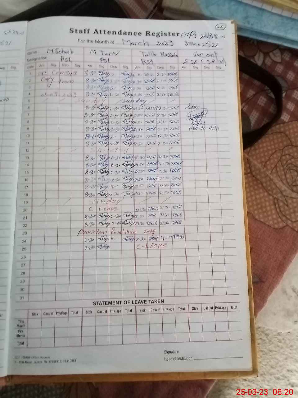 | CNIC | Full Name | Designation | R/C | Absence During Last Calender Month |