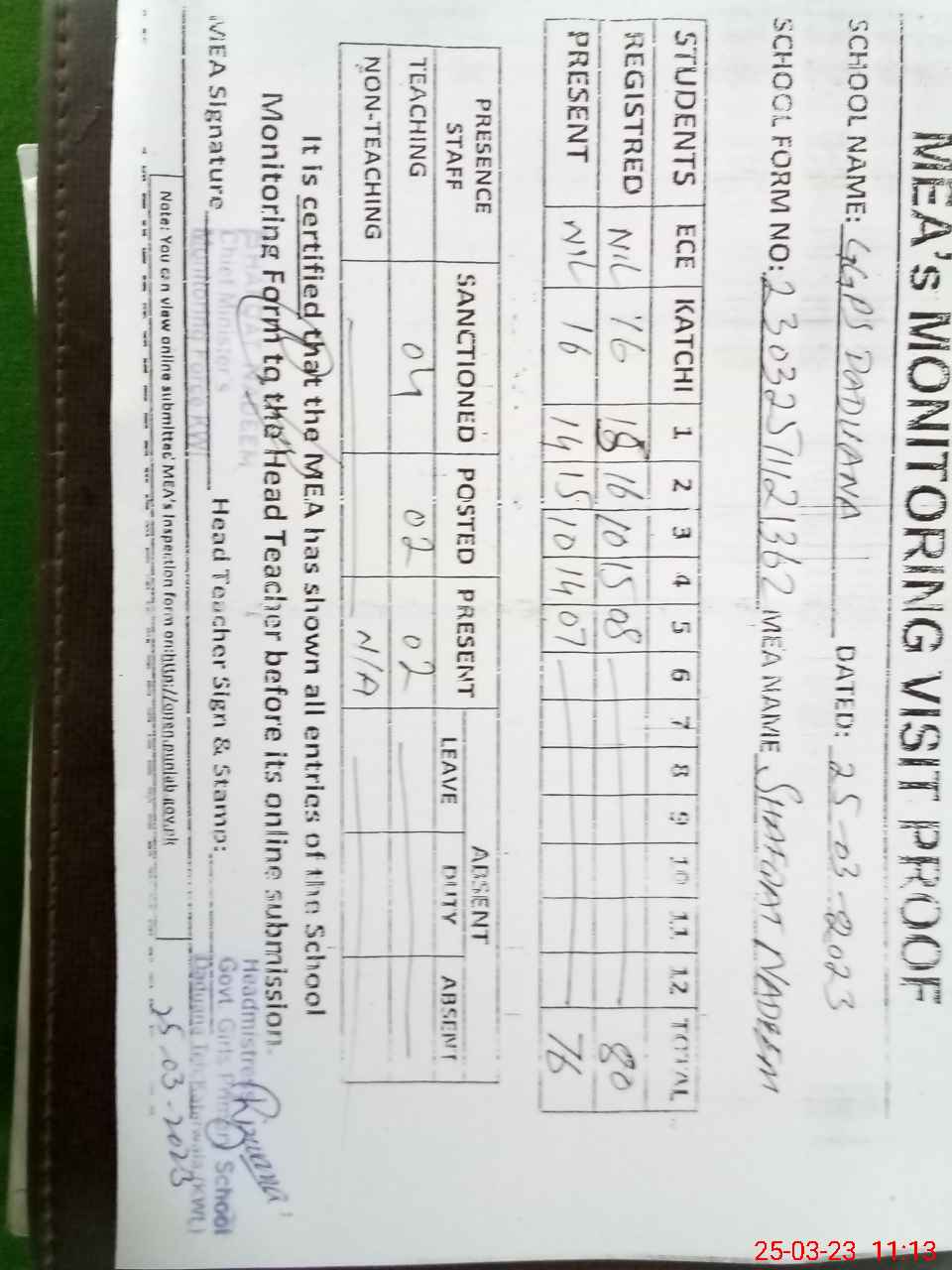 | Attendance Register | Head Teacher | MEA with School | Visit Proof |