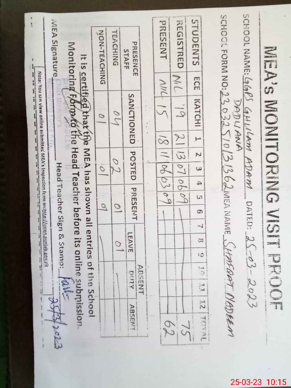 | Attendance Register | Head Teacher | MEA with School | Visit Proof |