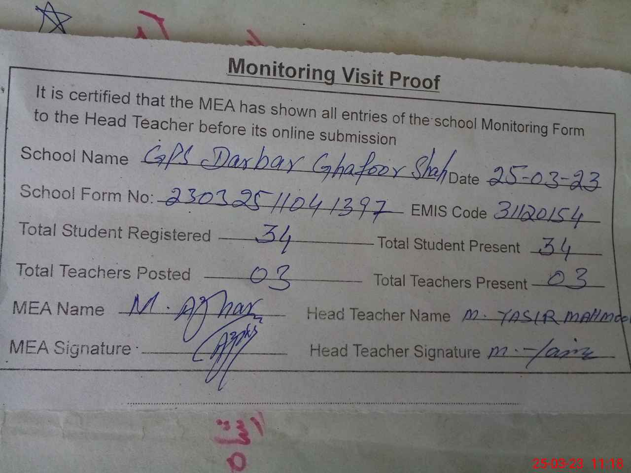 | EMIS Code: 31120154 | Name of School: GPS DARBAR GHAFOOR SHAH | |||