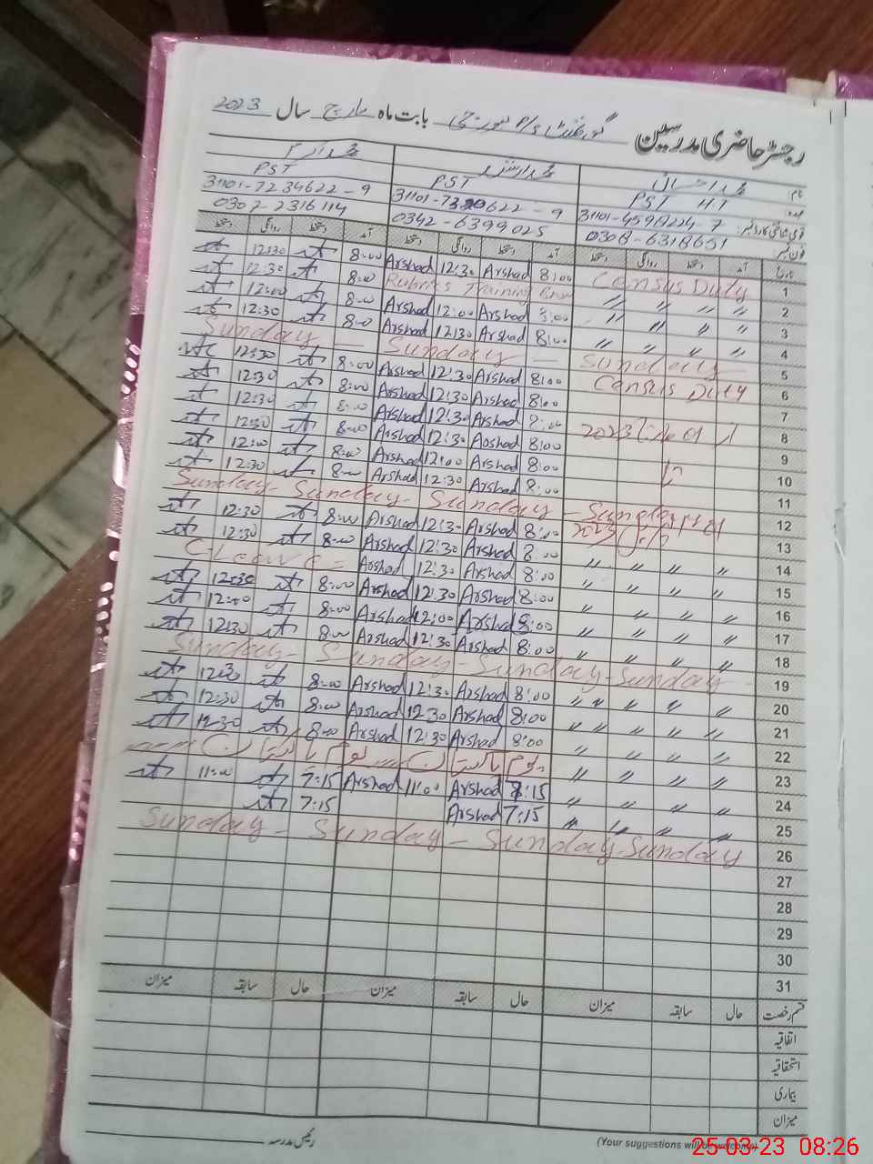 | CNIC | Full Name | Designation | R/C | Absence During Last Calender Month |