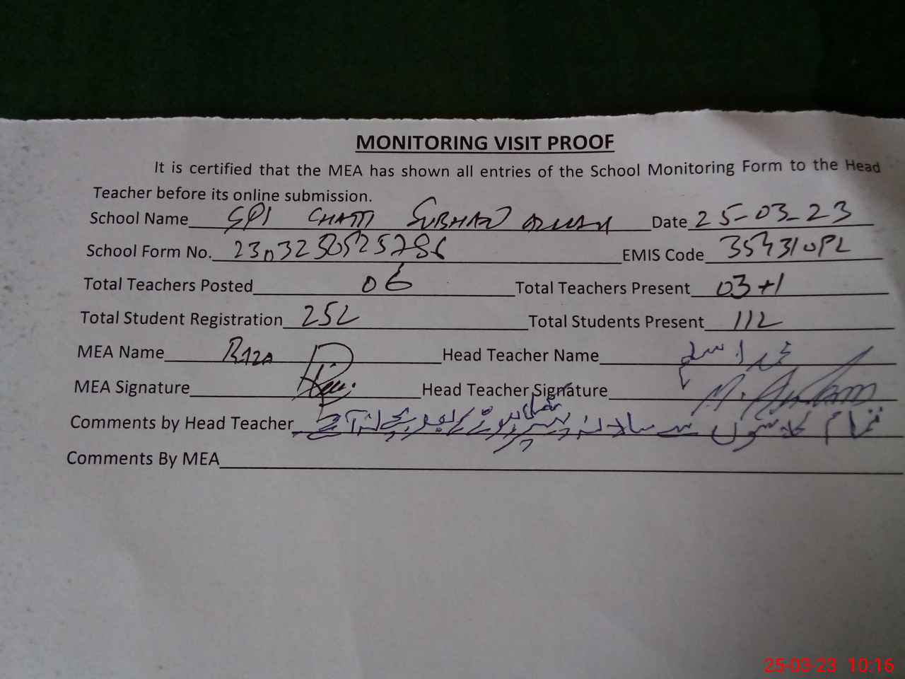 | Attendance Register | Head Teacher | MEA with School | Visit Proof |